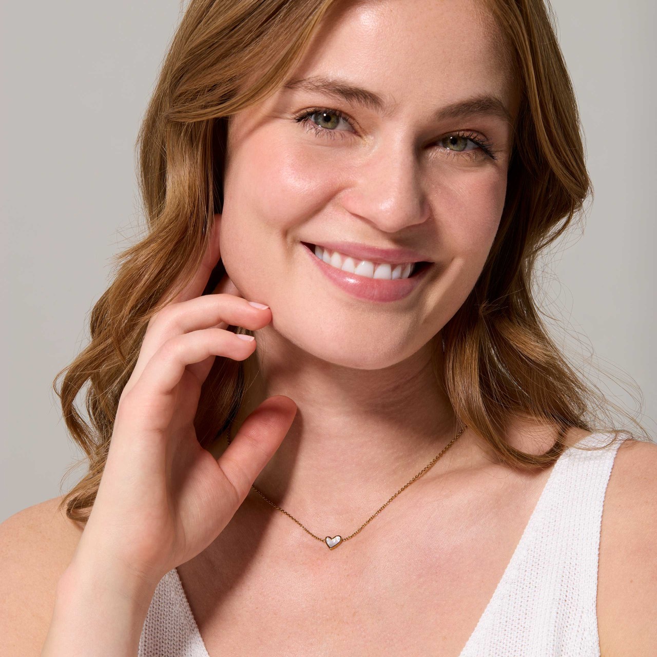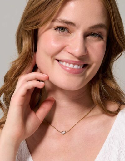 A smiling model wearing a Gold-coloured heart ring